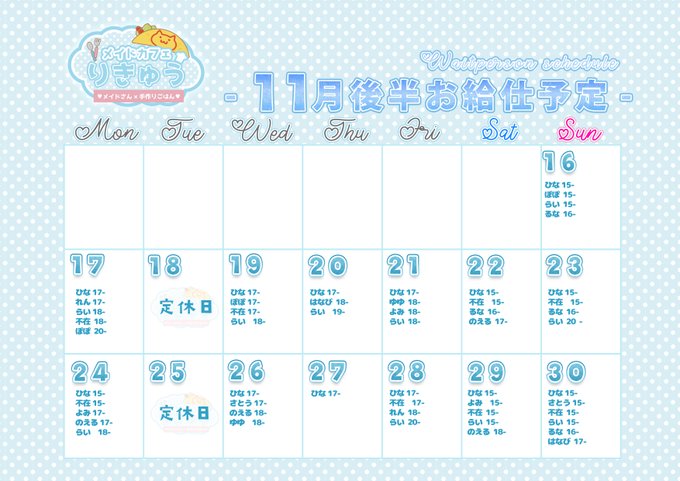 固定メイドカフェ🍴りきゅう🤍公式⟡@rikyuu_midcf·11月後半お給仕予定表🪄︎︎◝✩ シフトは追加になる場合もございます! 毎日りきゅうをチェックしてね! 𓈒𓏸𓈒꙳ 11月後半イベント ♥11/16 ビックパーカーイベント✨ ♥11/22-11/24 持参フードEV 🍽️🍳 ♥11/29-11/30 冬メイド服❄️63859