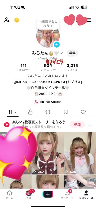 MUSIC CAFE&BAR CAPRICE(カプリス)さんがリポストみらい🧁@mirai_15tee·TikTok!念願のフォロワー様800名達成しました!🥹🎊 いつも応援ありがとうー!!!みんなのおかげです🥲 これからも投稿も頑張るし、歌もダンスも磨いて楽しいものをお届けしていくので見守ってくれたら嬉しいですー! 改めていつもありがとう!よろしくお願いします🧁🤍216270