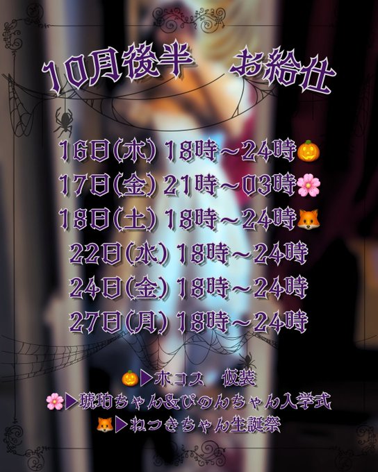 桃天えな🍑でりぽけメイド@ena_delipo·📝桃天えな10月後半お給仕🍑 🌸⇒こはくちゃまぴのんちゃま入学式 🦊⇒ねつきちゃま生誕祭 🎃⇒木コス(ハロウィン) 🍑🎂⇒えなぴ生誕祭(絶対きて🥰🎶) 10月もまだまだ楽しいイベントいっぱいなので楽しみしょー👊🔥❕ ✨🎃トリックオアトリート🎃✨314198