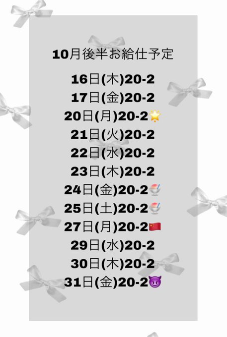 桃天えな🍑でりぽけメイドさんがリポスト甘音ぴあの🎵デビエンメイド@piano_devi_oki·10月後半お給仕予定表!! びっくりするほどたくさん居ます そしてイベントも盛りだくさん🎶 たくさん会いましょう🫶🏻 🌟▷でりぽけ→デビエン(12時移動) 🍧▷浴衣イベント 🇨🇳▷月コスチャイナ服 😈▷デビエン2周年イベント1330508