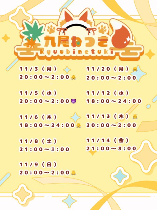 固定九尾ねつき🍁@でりぽけメイド@netuki_delipo·🍁🦊11月前半お給仕予定🦊🍁 11月前半のお給仕予定です🐾 最近お給仕予定が出せてなくてごめんなさい💦 今月から出来るだけ早く出せるようにします🦊💧 年末年始大変かと思いますので無理せずに、ご帰宅したい時にお顔見せに来てくださいね🏠✨ 今月もよろしくお願い致します🍁118278