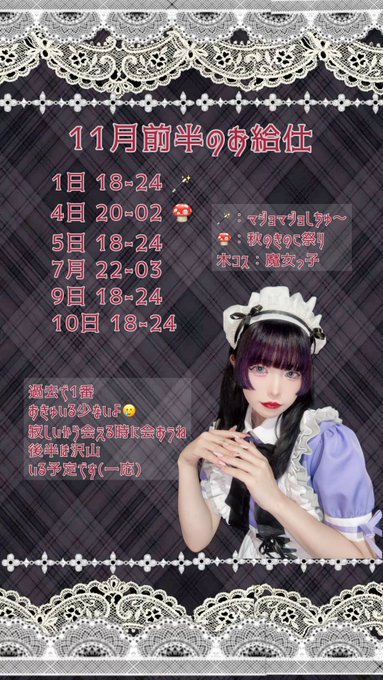 沖田ひめの🪞@でりぽけメイドさんがリポスト朧月ぴのん🐇でりぽけメイド@Pinon_delipo·11月前半お給仕予定ぴょん!✨(with千切) 寒くなってきたけどまだまだ秋!食欲の秋!fall🍁🎃🍂なので美味しそうな食べ物がもりだくさんでしゅょ〜ᵔ𐃷ᵔ 11/8にはなんともぎゅしゃまういしゃまのイベントがデビエンにてあります はしご決定ぴょんネ꒰ᐡ- ‧̫ -ᐡ꒱💞💞1313349