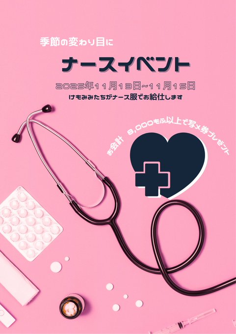 ねむ@kmmm_nemu·9時間ねむは15(土) 19:00~います💉♡引用Cafe & Bar けもみみ@エンジニア無料コンカフェ@0_kmmm_0·10時間🏥ナースイベント🏥 11月13日~11月15日 けもみみたちがナース衣装でお待ちしております❤️ 🤍お会計8,000もふ以上で写メ券プレゼント🤍 皆様のご来店心よりお待ちしております✨4166