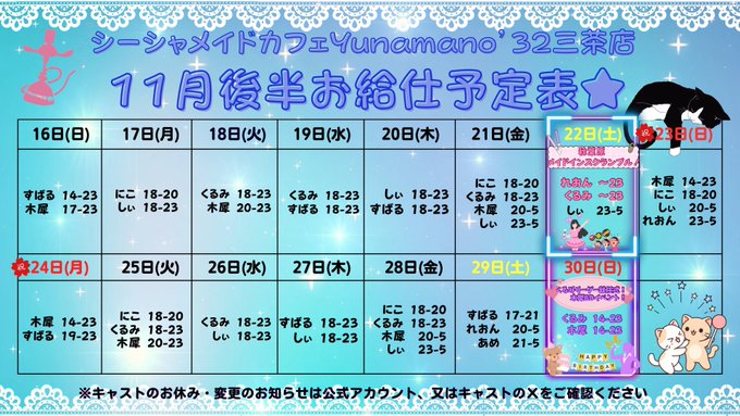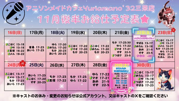 固定幻魔皇帝 鳳 坂本 雀春 🎃 三軒茶屋@ynmn32suba·11月後半作りました~♪ アニソンに- ̗̀ New ̖́- 子猫ちゃんてんこもり!個性豊かで賑やかで楽しい子達なのでたくさん顔見に来てね🐾^›⩊‹^ 22日は秋葉原のメイドインスクランブルLIVE❗️ 29日30日はアニソン、シーシャそれぞれイベントあるので要チェック❕✅☝🏻 ̖́-3601