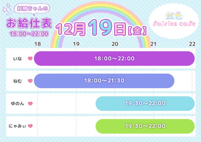 虹色fairies cafe🌈キャスト募集中🧚🏻♀️@nijicafe_osu03·本日もご入国いただいた皆様ありがとうございました✨ 明日12/19(金)は18:00開国! お間違いないようお願いします💡 妖精ちゃん🧚🏻♀️⬇️ いな@ina_nijicafe ねむ@nemu_nijicafe ゆのん@yunon_nijicafe にゃみぃ@nyami_nijicafe 旅人の皆さまお待ちしてます🌈 #コンカフェ #大須23150