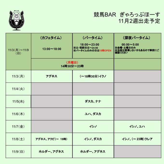 ぎゃろっぷほーす🐎 競馬BAR🏇@GallopHorse_OA·お待たせしました!ぎゃろっぷほーす今週のシフト表です🐴今週もよろしくお願いします! #競馬好きな人と繋がりたい #競馬バー #umajo212242