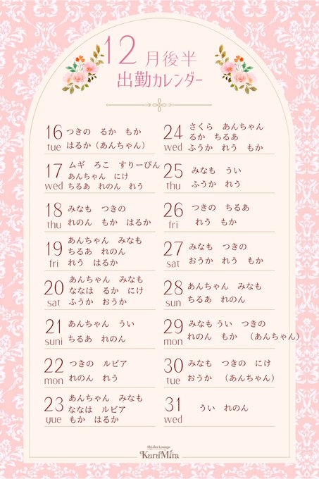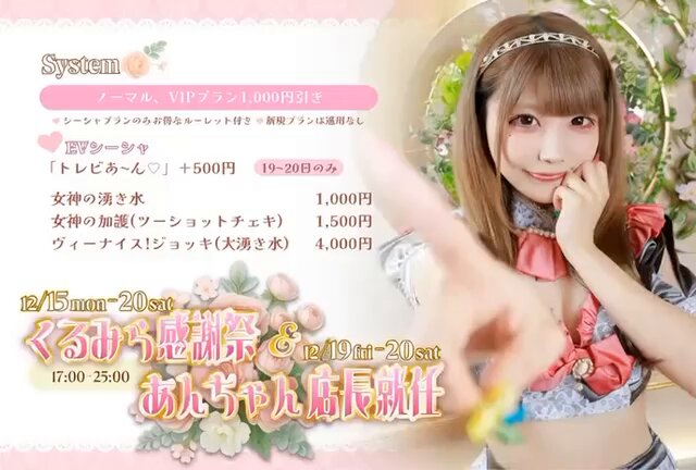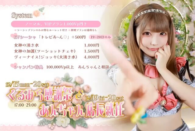 固定Kuru Mira(くるみら)歌舞伎町シーシャコンカフェ@Kurumirage·🌸くるみら12月後半女神シフト🌸 15〜20日はくるみら感謝祭&あんちゃん店長就任EV☀️ 17日GGPL新宿ゲストEV🪙 23〜25日はクリスマスEV🎄 遠隔➡️ http://kurumirage.base.shop 12月後半もたくさんの騎士様と思い出が作れますように💭 女神一同お待ちしております💖0:060:060:064101,344
