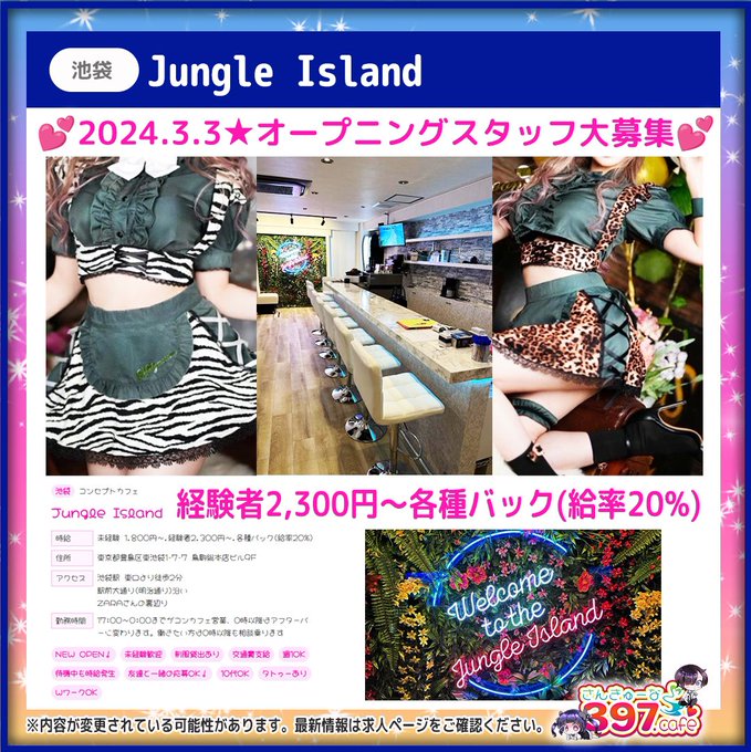 Jungle Island コンカフェ求人@kr770443·【ジャングル🌴】【アニマル🐯】が コンセプト、2024.3.3グランドオープン 池袋コンカフェ 🐆Jungle Islandです🦓 お店の【ルール】はみんなで考える、 オープンから2ヶ月皆さん楽しそうにお勤め頂けてます まだまだ積極採用中♪