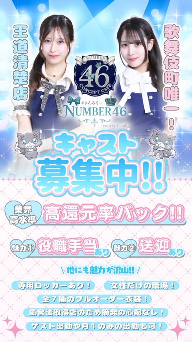 【#よんろくっ】NUMBER46【王道清楚コンカフェ】新宿 歌舞伎町 業界最大級拡大移転決定!@conceptcafe_46·【コンセプトカフェ #NUMBER46】 ~ 本日のおきゅいん ~ 🩵りかなプロデューサー 🩵なつき店長 🤍とい 🤍きあら 🪽シークレットキャスト 🔰新人キャスト 営業時間:18:00 〜 25:00 (L.O24:00) 場所:歌舞伎町2-39-8 ダーマビル6階11282