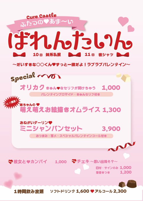 くろえ♡@cure_kuroe·4時間います!ちょこ当日分もちょっぴりありますᐡᴗ ᴗᶻ𝗓🍫♥︎引用CURE CASTLE🏰(キュアキャッスル)2/2.9.12店休日@Cure_Castle·7時間本日のきゅあは❣️ バレンタイン後半戦💕 ブロマイド付きオリカク🍹 手作りチョコ🍫 写メ付きミニシャン🥂 スペシャルセットは 手作りチョコにシャンパン🥂 ブロマイド📸メッセージカード💌付き 更に!スペシャル撮影ブースを 使用した2ショット写真も♫ オリシャンver.は選べる特典付き🎁💗 x.com/cure_castle/st…215273