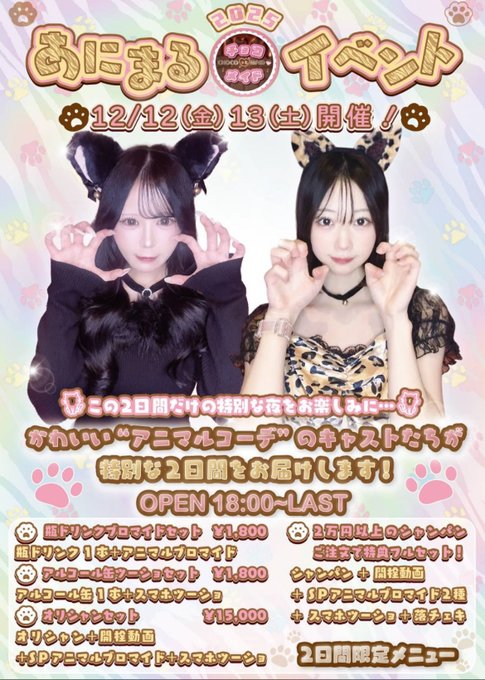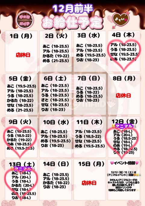 固定せな@chocoto_sena·♡12月前半お給仕予定♡ 今更ですが前半予定‼️アニマルイベント両日ラストまでいます🐱 ご帰宅お待ちしてます💕4163