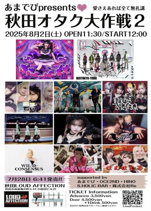 あまでびさんがリポスト秋田オタク大作戦【公式】@akita0th·【秋田オタク大作戦2】8/2開催 7/28 前売チケット発売 🎫 https://t.livepocket.jp/e/eabg0 OPEN 11:30 / 終演後特典会終了18:40 はむはむ亭 あまでび WIL•D•CONSENSUS ゼロ・グラビティ Devil Labyrinth 辻らいらい コバラヘル CHICKEN BLOW THE IDOL JUGS MAFIA NEOTOKYO-TRIBE 愛成来来あにゃるさんと他9人12272,154
