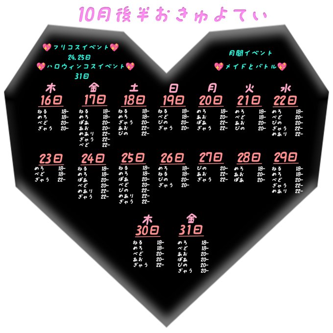 固定Moi 広島コンカフェ@Moi_nakanohito·🎀10月後半の出勤予定🎀 ✨24.25日フリコスイベント✨ ✨31日ハロウィンコスイベント✨ ✨月間 メイドバトルイベント✨ #コンカフェ #広島コンカフェ #広島 #moi #広島メイド147