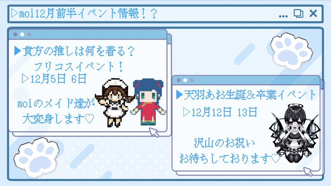 Moi 広島コンカフェ@Moi_nakanohito·12月前半のイベントはこちら‼️ ♡5.6日はフリコスイベント ♡12.13日は天羽あお生誕&卒業イベント 沢山のご主人様方のご帰宅お待ちしております🎶 ⬇️詳しくは画像をチェック2358