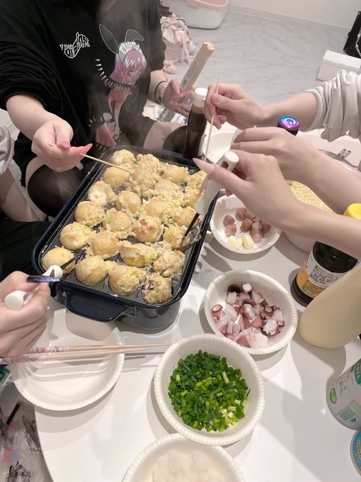 ☠どくろa.k.a.ちゃま🍓@cp_dokuro·くあむまりいほむら+どくろフレンズでたこやきパーティーをしています。頑張らせています555