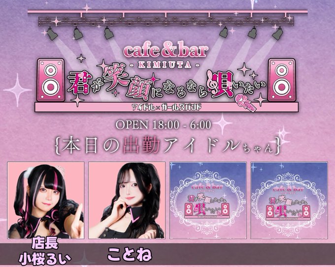 君が笑顔になるなら唄いたい【キミウタ】@Cafebar_kimiuta·Cafe&bar 君が笑顔になるなら唄いたい ㊗️1周年イベント㊗️ 本日のアイドルキャストは🎤 22- 小桜るい@Kozakura_rui 23- ことね@Kz_zo0 皆様のお越しをお待ちしております❕ #ミナミ #大阪 #宗右衛門町226