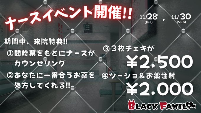 あのねさんがリポストBLACKFAMILY😈悪魔アイドルコンセプト 福岡春吉コンカフェ@BlackFamily_off·【イベントのお知らせ】 😈ナースイベント😈 期間:11/28㈮~11/30㈰ 期間中、来院されたらいろんな特典が!!✨ ①問診票の内容によって、あなたに1番あうドリンクを処方してくれる!! ②チェキ(ツーショ)&お薬注射ショット💉 ¥2,000 ③3枚ソロチェキ📷 ¥2,500さらに表示11251