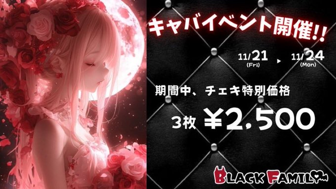 あのねさんがリポストBLACKFAMILY😈悪魔アイドルコンセプト 福岡春吉コンカフェ@BlackFamily_off·【イベントのお知らせ】 キャバドレイベント開催😈 イベント期間:11/21㈮~11/24㈪ 期間中、チェキ3枚が特別価格✨ ¥2,500🉐 普段見れないレアなキャバドレのチェキぜひGETしてください😈💜1465