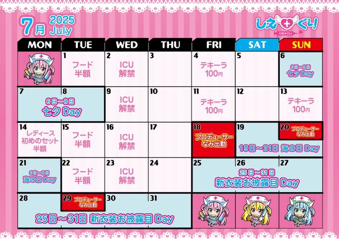 固定しえ♡くり❤️🔥某有名女優プロデュースのお店❤️🔥 【コンカフェ歌舞伎町】@cieloclinic_kab·˙˚ʚ 7月のカレンダー👼🏻🫧 ɞ˚˙ 毎週月曜日フード半額🍽 火曜日icu解禁👼🏻 木曜日日曜日テキーラ100円🥃 ❤︎18.20.29日プロデューサーnami出勤日🩵 ❤︎6~8日七夕day🎋 ❤︎19~21日海の日day🐟 ❤︎25~31日新衣装お披露目🌟🫧 詳細後日💭💭7425,103