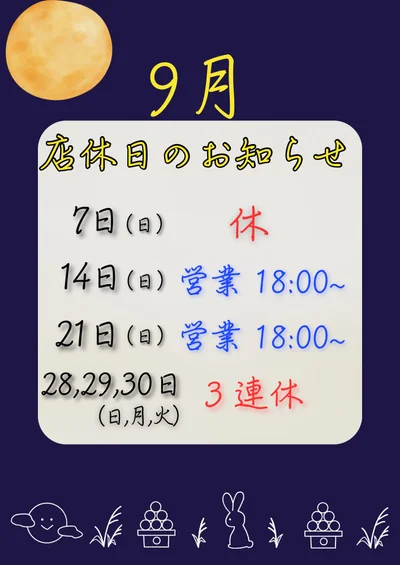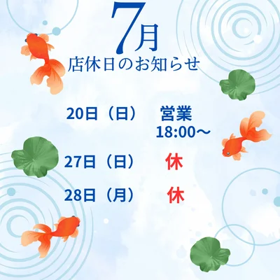 7月18日 1:01 / 出勤 7月店休日のお知らせ🎐