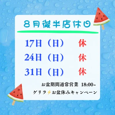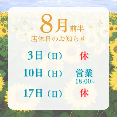8月3日 13:15 / 出勤 ~8月前半店休日のお知らせ~