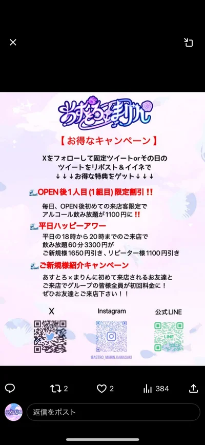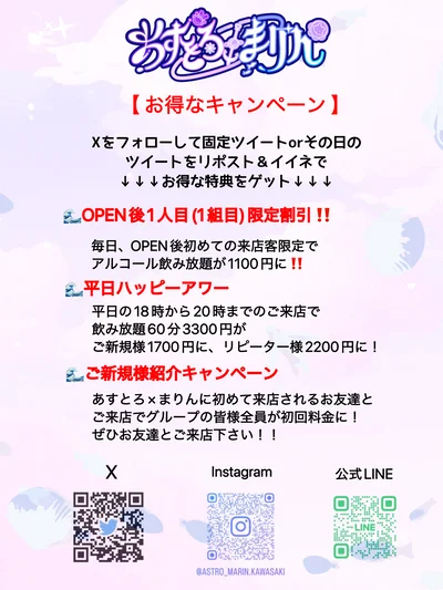 平日は18時から20時の来店でご新規様アルコール飲み放題60分1700円、リピーター様2200円のキャンペーンも開催しております🙇♂️