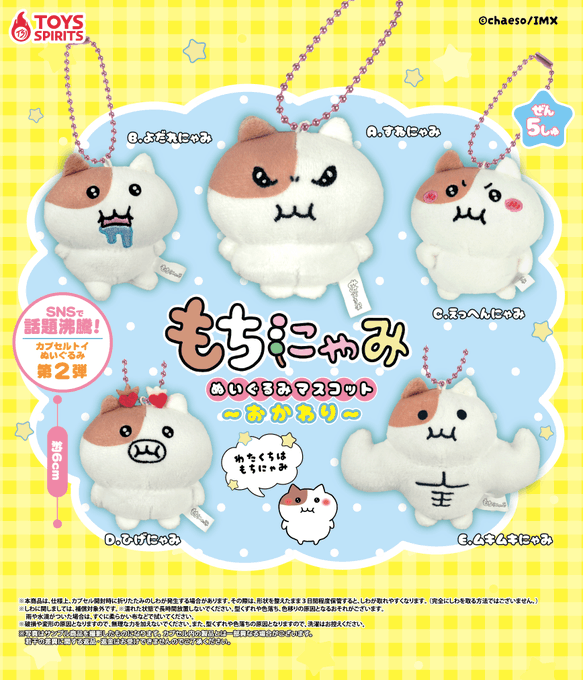 りり 3/22ラスト⟡.·@ririnya2_·7時間ほしい😭😭😭😭😭😭えっへんかわいい😭😭😭😭😭😭😭😭😭😭引用もちにゃみ@MOCHINYAMI·8時間📢カプセルトイ新商品発売のお知らせ🍡 トイズスピリッツ様( @toysspirits )より 「ぬいぐるみマスコット~おかわり~」が発売❣ 大好評でした、ぬいぐるみ第1弾に続き さらに可愛くなった 色々なもちにゃみが登場(全5種)✨ 2月下旬から全国で順次発売予定です💝 #もちにゃみ #カプセルトイ1427