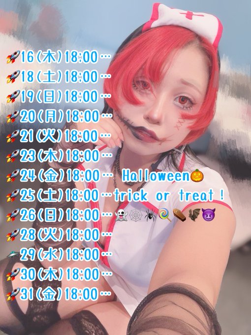 固定ひよこ🐣オン眉ますたーひこよ 痩せろ。@asupia_hiyoko·🚀10月後半乗船&召喚予定🛸 🚀16㈭ 🚀18㈯ 🚀19㈰ 🚀20㈪ 🚀21㈫ 🚀23㈭ 🚀24㈮ ハロウィンイベント! 🚀25㈯ trick or trwat 🚀26㈰ 🎃👻😈⚰🦇🍭🕸 🚀28㈫ 🛸29㈬ 🚀30㈭ 🚀31㈮ 全部オープンからいます❣ ハロウィンイベント楽しみ〜!! 全部スケベにするか悩みんちゅ15499