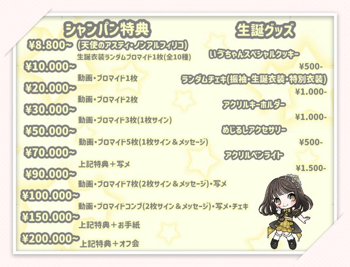 もなか🔰くえすちょん?さんがリポストいゔ🍼くえすちょん?@QQQ_eve·10月8日いゔ生誕祭のシャンパン特典と生誕グッズです❣️ご確認お願いします♡.·*. 生誕グッズは数に限りがあるので早めに𝐆𝐄𝐓してください🌹✨ 質問やご相談はDMにお願いします!引用IDOLcafe&Bar くえすちょん?|コンカフェ富山|アイドルライブ毎日開催中🎤@Bar_question_·9月18日10月31日(金)11月1日(土) 🍼いゔ生誕祭🍼 【@QQQ_eve 】 いゔ生誕祭2Days開催決定🎉 みんなでいゔちゃんの20歳のお誕生日を お祝いしましょう🎂🥂 来店特典.生誕オリシャン. オリジナルグッズ.各種特典あり💛 たくさんのご来店お待ちしております♪ #くえすちょん #富山 #コンカフェ113314,873