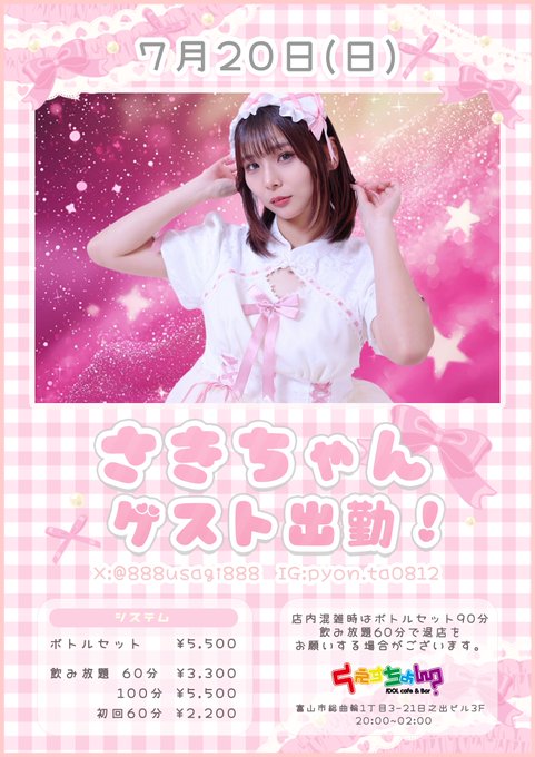 ねむ🔰くえすちょん?さんがリポストIDOLcafe&Bar くえすちょん?|コンカフェ富山|アイドルライブ毎日開催中🎤@Bar_question_·7月20日(日) 🩷さきちゃんゲスト出勤🐰🍜🩷 【 @888usagi888 】 IDOLcafe&Barくえすちょん? ゲストイベントの開催が決定しました✨ 皆様のご来店お待ちしております♬ #くえすちょん #コンカフェ #富山 #ゲスト出勤 #アイドルカフェさきちゃん🐰🍜10月26日生誕祭さんと他1人9223,325