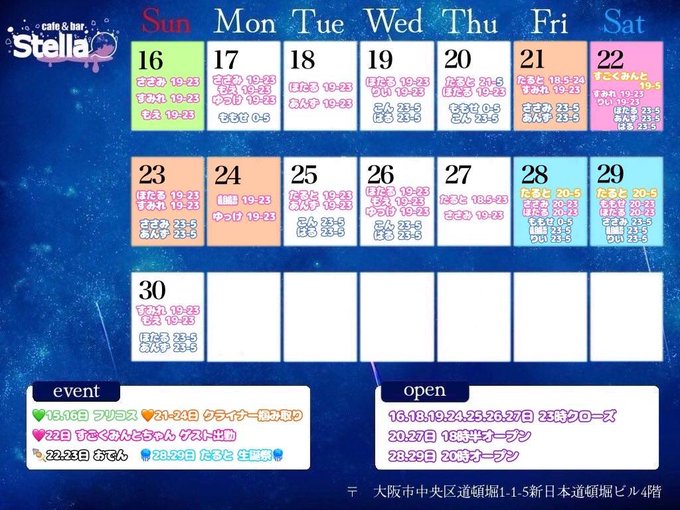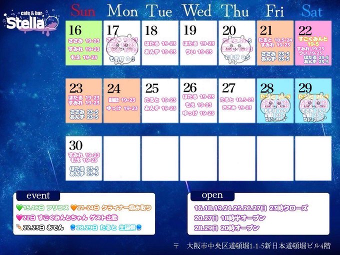 すみれ⭐️さんがリポストcafe&bar Stella@Stella20226·11月後半シフト(改訂版) ゲストやたるとの生誕㊗️あるので是非ご来店お待ちしてます🌟33325