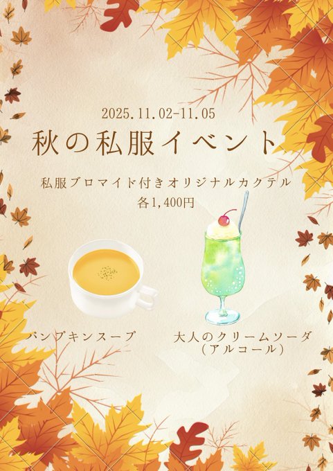 ちとせさんがリポストメイドカフェsweet macaron(スイートマカロン)🍬上野・御徒町@sweet_macaron_·🍁本日より私服デー🍁 4日間限定❣️メイド達が私服でお給仕します🍂 \サイン入りブロマイド付き/ イベントオリカク ¥1,400🍄 ・パンプキンスープ ・大人のメロンソーダ(アルコール)973,871
