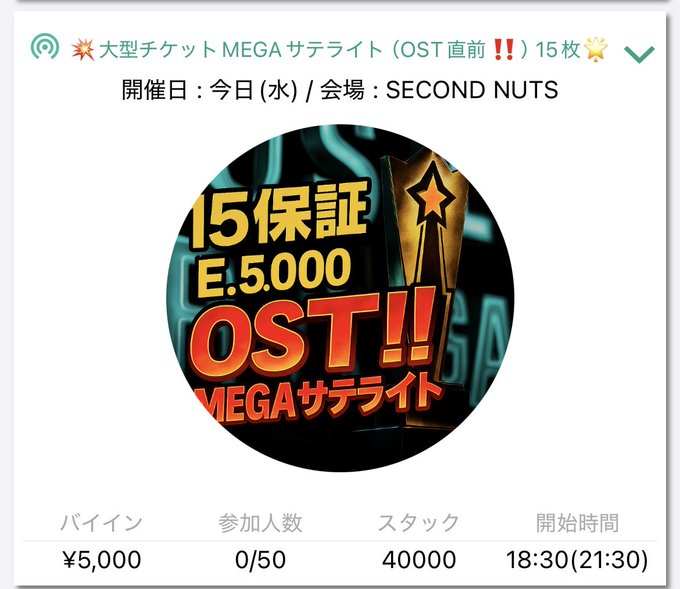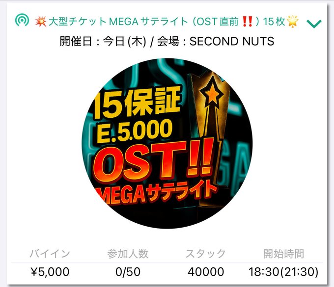 みわ@セカなつ@komusume__jp·10月21日大型のマルチサテライト! コインにも変換できます!引用SECOND NUTS♧セカンドナッツ♤ポーカー♡名古屋 栄@SecondNutsPoker·10月21日【10/21 火曜日】 ⚔️大型大会マルチサテ10枚保証⚔️coinにも変換可🪙 🕡 スタート 18:30 🕒 クローズ 21:30 (受付終了) 💰 参加費 エントリー:¥5,000 / 40,000点 リエントリー:¥4,000 / 40,000点 レイトアドオン:¥2,000 / 20,000点 🐔アーリーバード🐔さらに表示340