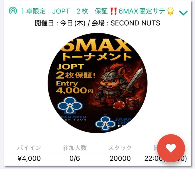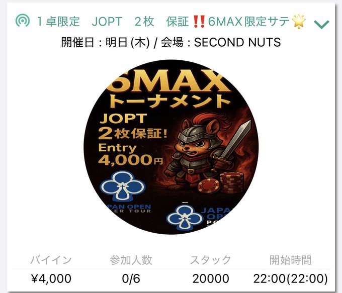 みわ@セカなつ@komusume__jp·10月29日本日18:30からはjoptサテライト! 大阪前にチケット集めに最適かも!?引用SECOND NUTS♧セカンドナッツ♤ポーカー♡名古屋 栄@SecondNutsPoker·10月29日10/29 【水曜日】 ~15枠保証🌟JOPT直前!JOPTサテライト♧~ 🕡 スタート 18:30 🕒 クローズ 21:30 (受付終了) 💰 参加費 エントリー:¥8,000 / 40,000点 リエントリー:¥6,000 / 40,000点 レイトアドオン:¥3,000/20,000点 🐔アーリーバード🐔さらに表示1411