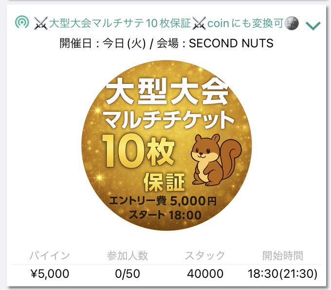 SECOND NUTS♧セカンドナッツ♤ポーカー♡名古屋 栄@SecondNutsPoker·⚔️大型大会マルチサテライト8枚⚔️coinにも変換可能🐿 🕡 スタート 18:30 🕒 クローズ 21:30 (受付終了) 💰 参加費 ‼️シングル、ダブルなしのエントリー5000円‼️ エントリー:¥5,000 / 40,000点 リエントリー:¥4,000 / 40,000点 レイトアドオン:¥2,000/20,000点さらに表示1024,331