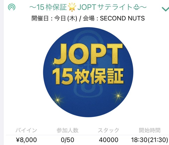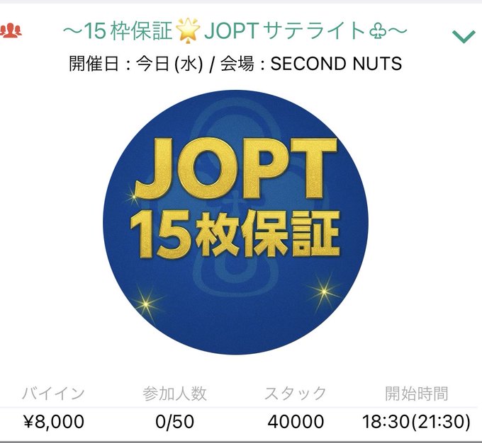 みわ@セカなつ@komusume__jp·10月30日本日もサテライト! 大阪jopt前に!引用SECOND NUTS♧セカンドナッツ♤ポーカー♡名古屋 栄@SecondNutsPoker·10月30日【10/30 木曜日】 ~15枠保証🌟JOPT直前!JOPTサテライト♧~ 📓2025.10/30~11/3. ♧JOPT osaka♧ 📍堂島リバーフォーラム 🕡 スタート 18:30 🕒 クローズ 21:30 (受付終了) 💰 参加費 エントリー:¥8,000 / 40,000点 リエントリー:¥6,000 / 40,000点さらに表示131,192