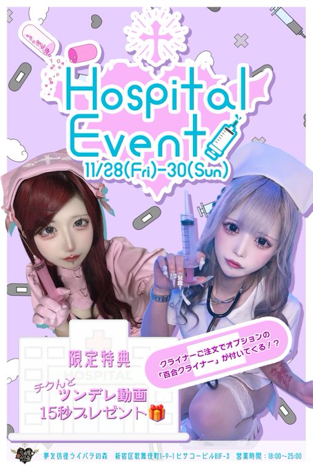 といにゃ🐈⬛🩸@_10ichan·6時間3日間シンプルにナース服着ます💉🩸引用夢を彷徨うイバラの森@yumemoricafe·11月23日💉🚑ホスピタルイベント🏥💊 眠り姫一同、個性たっぷり様々な病院コスプレでお出迎え❤️🤍💉🩸 📅 2025年11月28日(金)29日(土)30日(日) 🕕 18:00〜25:00 📍 新宿区歌舞伎町1-9-1 ヒサコービルB1F-3 イベント限定特典▷▶ボトル開栓にてちくんとツンデレ15秒動画プレゼント🎁 フライヤーガール▷▶︎151,933