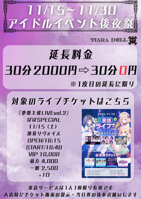 夜冥 いヲた@cx__nya·15時間まだチケット間に合う🎟.·‼️ あいにきてよーーー💟引用👑TIARA DOLL👑 池袋東口のコンカフェ🖤@tiara_doll_·18時間【お知らせ】 11/15(土) 遂に…… 待ちに待ったアイドルイベント🏴☠️💜 TIARA DOLLの海賊メイドがアイドルに⁉️ イベント後は後夜祭もあるので お楽しみに💕イベントチケット提示でお得にご参加いただけます♪ チケットはこちらから購入可能です↓ https://ticketdive.com/event/musou_ikebukuro2?pvtoken=34JCHFcl…4234
