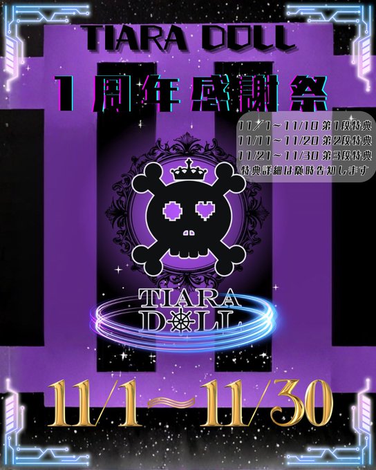 夜冥 いヲた@cx__nya·5時間Tiaradoll 1周年です💟 おめでとうしにきてね🫵🏻🙂↕️‼️引用👑TIARA DOLL👑 池袋東口のコンカフェ🖤@tiara_doll_·16時間この度TIARA DOLL 11月で1周年を迎えるにあたり感謝祭を開催させていただきます❣️ 皆様へ日頃の感謝といたしまして 第3弾まで特典をご用意しております🏴☠️ 第1弾の特典は本日発表させていただきます✨1128
