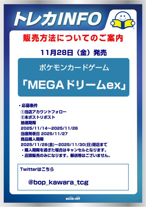みうみう@ポケカ垢🐩さんがリポストブックオフ河原町オーパ店トレカ担当✨BOOKOFF PLUS Kawaramachi-OPA@bop_kawara_tcg·抽選販売 #ポケカ ✅MEGAドリームex 抽選販売 ⚠️店頭受取のみになります。郵送等はありません。 応募期間:11月26日 ✅@bop_kawara_tcgをフォロー ✅このポストをリポスト ■購入期間:11月30日(日)まで #河原町オーパ501,5895594.3万