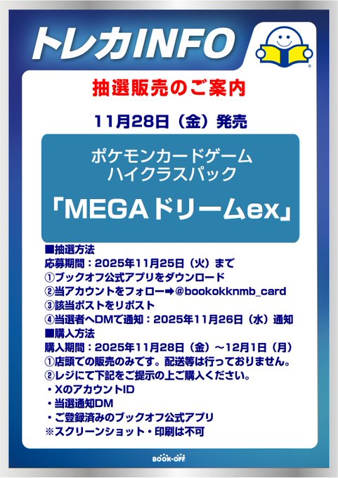 みうみう@ポケカ垢🐩さんがリポストブックオフ なんば 戎橋店 @トレカ BOOKOFF Nanba Ebisubashi Store@bookoffnmb_card·【抽選販売のご案内】 #ポケモンカード #ブックオフなんば 1⃣1⃣月2⃣8⃣日発売‼️ 最新弾 ハイクラスパック 『MEGAドリームex』 ⚠️当日の一般販売はございません ⚠️ご当選時の販売は店頭のみ ⚠️シュリンクは外しての販売になります 抽選方法や購入方法につきましては 添付の画像をご確認ください🔍772,6591,0525.9万