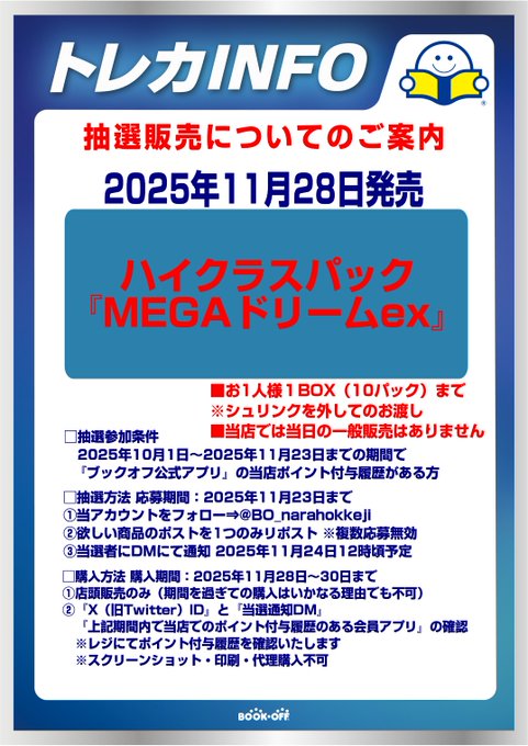みうみう@ポケカ垢🐩さんがリポストブックオフ奈良法華寺店@トレカ担当@BO_narahokkeji·✨✨ハイクラスパック✨✨ ⚫️『メガドリームex』 抽選販売⚫️ ✅抽選参加条件 2025年10月1日~2025年11月23日までの期間で 『ブックオフ公式アプリ』の 当店ポイント付与履歴がある方 ✅応募期間 2025年11月23日まで 詳細は画像をご確認ください‼️127803042.8万