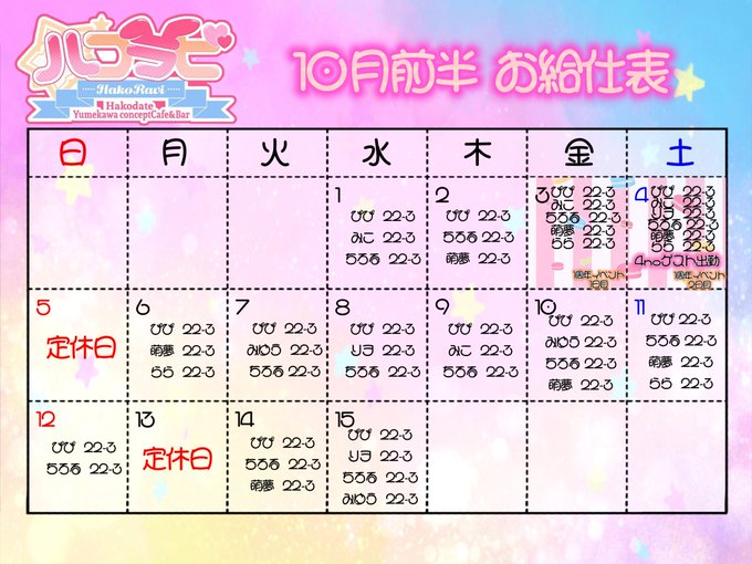 ハコラビ【函館Yumekawaコンセプトcafe&bar】@hakoravi·お待たせ致しました!🐰 10月後半のお給仕表が完成しました!✨ そして10/29-31はハロウィンイベント! そして10/31.11/1はリヲ(@rio_hkrv )バーズデーイベント! 10月後半もたくさんのラビットちゃんが待ってます🐰 #ハコラビ #函館 #コンカフェ #函館コンカフェ #コンセプトカフェ17950