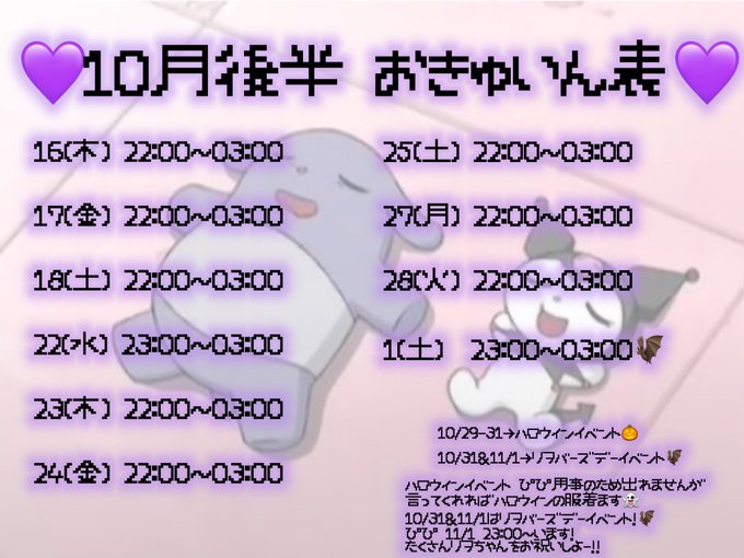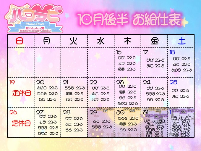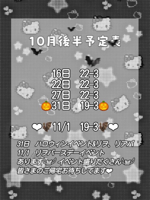 ハコラビ【函館Yumekawaコンセプトcafe&bar】さんがリポストリヲ 11/1 BD@rio_hkrv·10月後半予定表です𓆩𖠌𓆪 イベント沢山あります!楽しみです!皆さまのご帰宅めちゃめちゃお待ちしてます🦇❤︎111616
