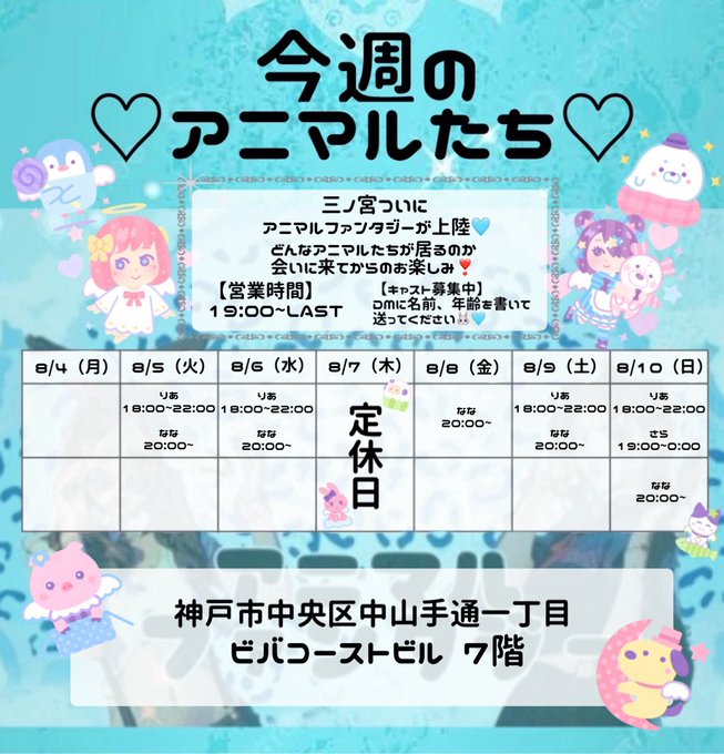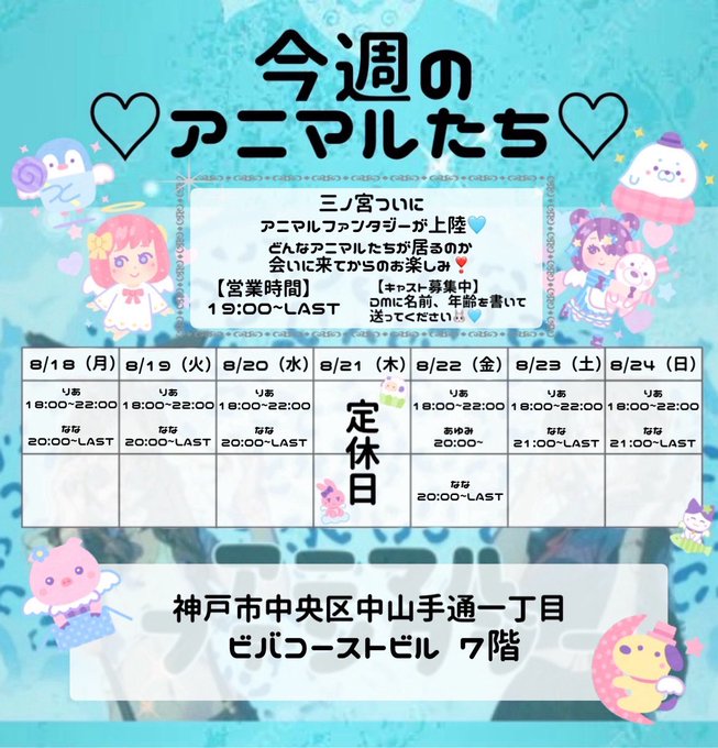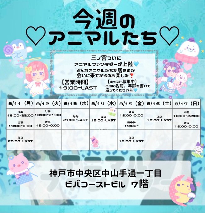 固定アニマルファンタジー@animaru0201·8/11〜8/17までのアニマルちゃんたち🐹🏖 #コンカフェ #コンセプトバー #ガールズバー #コスプレ #三ノ宮 #大阪 #アニマルカフェ #キャスト募集中23