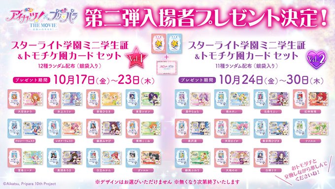 嶺亜☠@ビジュラム福岡天神店さんがリポスト【公式】『アイカツ!×プリパラ THE MOVIE -出会いのキセキ!-』@a_p_10movie·// 劇場入場者プレゼント第二弾決定🎁✨ \\ 大ヒット上映中🌟 今週末10月17日(金)から 第二弾の入場者プレゼントを実施します‼️ ⭐️スターライト学園ミニ学生証&トモチケ風カード 2枚セット Vol.1 12種ランダム配布 🗓️配布期間:10月17日(金)〜10月23日(木)さらに表示852.5万5.3万217万