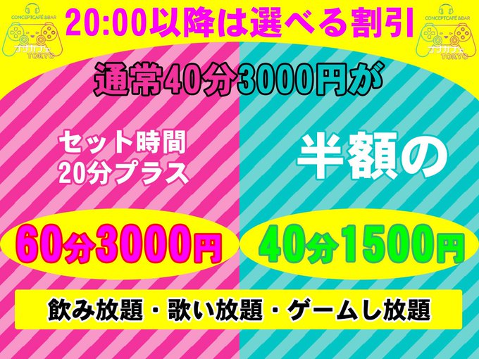 コンカフェTOKYO By_ULTRA🎮池袋コンカフェ@gameconcafe·池袋コンカフェTOKYOの20:00以降のイベントは 🈹選べる割引🈹 🅰️40分+20分の【60分3,000円】 or 🅱️3,000円-1,500円の半額割りで【40分1,500円】 🅰️長めにお得に楽しむ 🅱️お安く楽しむ お選び出来ます ※最初のワンセット限定割引 ※初回はもちろん会員様もご利用🉑 ※ハッピーアワーとの併用不可39