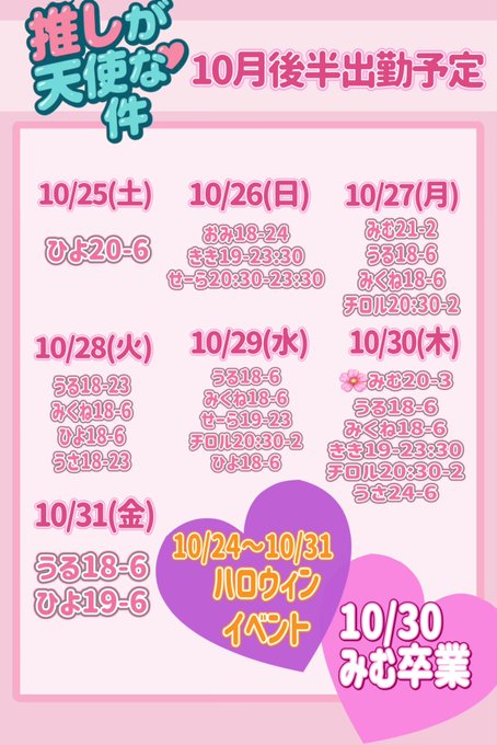 うるかもしれないさんがリポスト🩷推しが天使な件👼🏻🪽すすきの第5桂和4F@oshiten_keiwa·👼🏻推しが天使な件 10月後半シフト👼🏻 🎃10/24-10/31 ハロウィンイベント 色んなコスプレに変身するよ👻♡ 🌸10/30 みむ@_yakiimo00 卒業🌸 オリシャン発売予定です♡ 詳細は後日ツイートします🤍 ※営業時間や天使ちゃん出勤情報は変更される場合がございますご了承くださいm(_ _)m11163,469