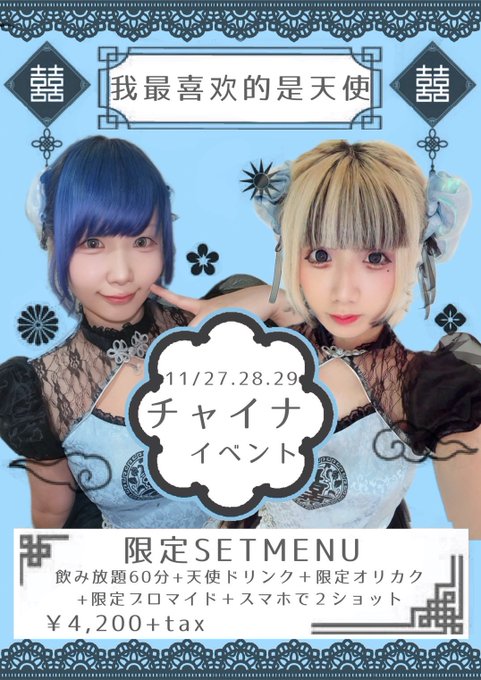うるかもしれない@uru8c·11月21日チャイナイベやるよー!引用🩷推しが天使な件👼🏻🪽すすきの第5桂和4F@oshiten_keiwa·11月21日【緊急告知🐼】 🇨🇳推し天チャイナイベント🇨🇳 ▷▶︎▷11/27-29 開催決定‼️‼️ 🐼チャイナイベント限定セット🐼 飲み放題(60分)➕天使ドリンク➕限定オリカク➕限定ブロマイド➕2ショット▶︎¥4.200+tax 天使ちゃんからのリクエストでございます大変可愛いが詰まっております♡♡さらに表示111803