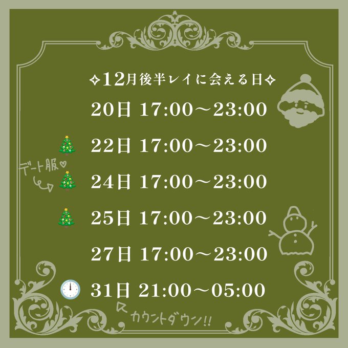 固定レイ🕸@ビジュラム札幌すすきの@bjlmspk_rei·✧︎12月後半入国予定✧︎ 22-25日 クリスマスイベ🎄(24日はなんとデート服だよ!) 31日 年末カウントダウン🕛 イベントたくさんで幸(>ᴗ